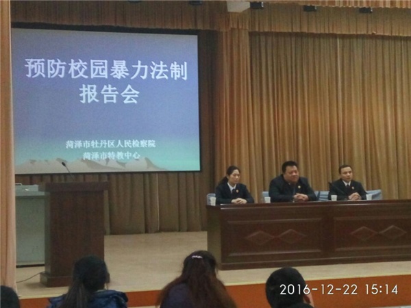 12月22日下午,菏泽市牡丹区人民检察院党组成员、检察委员会专职委员、全国青少年优秀辅导员尹庆慧为我校师生做了一场精彩的“预防校园暴力”法制报告会。