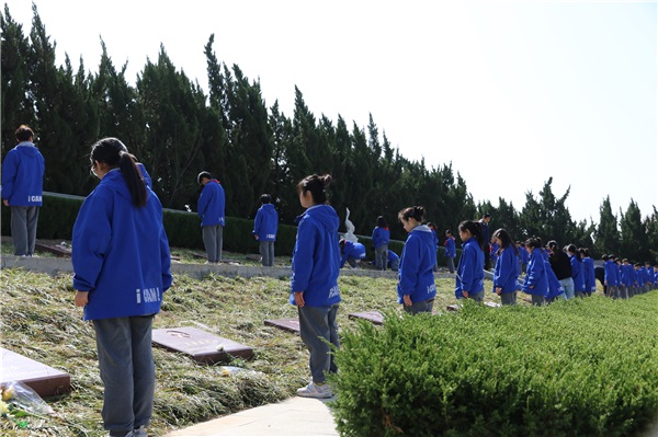 最后,同学们瞻仰烈士墓,将寄托哀思的菊花恭敬地放置在墓碑前,鞠躬默哀,并用干净的工具为每一位英烈擦拭碑文。